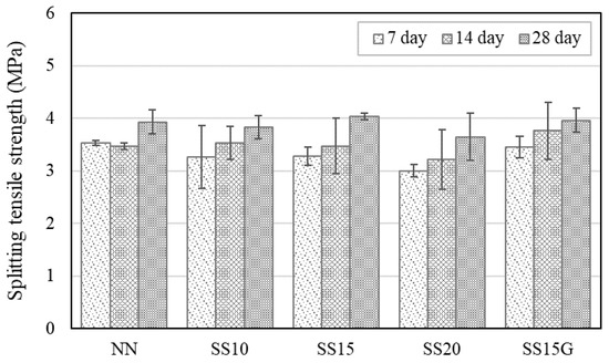 The splitting tensile strength of concrete containing steelmaking slag also followed similar trends as those of compressive strength, which is shown in Figure 7. Incorporation of steelmaking slag lowered the splitting tensile strength, and, at seven days, SS10, SS15, and SS20 decreased in strength by 7.71%, 7.31%, and 15.12%, respectively, compared to NN. However, the decrease in strength by steelmaking slag was improved through the incorporation of gypsum, and, at 14 and 28 days, SS15G increased in strength by 8.30% and 14.06%, respectively, compared to NN.