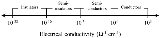 Steelmaking slag is a well-known conductive material that has a large amount of iron oxide, which is the main ingredient of magnetite (Fe3O4), with the electrical conductivity of 100–1000 Ω−1 cm−1, and this is within the range of semi-conductors [34]. Figure 8 represents the range of electrical conductivity.