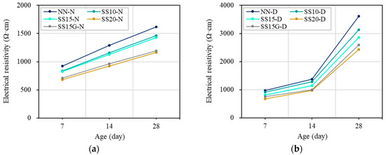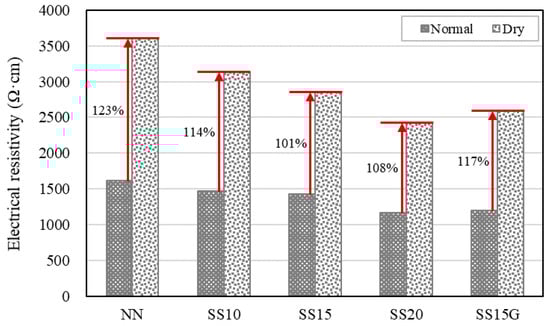 At 7 and 14 days, NN showed the highest electrical resistivity of all mixes. The incorporation of steelmaking slag decreased the electrical resistivity of concrete, and the conductivity of the concrete was shown to be better as the replacement ratio of steelmaking slag was increased. It is noteworthy that the incorporation of gypsum affects the electrical resistance of concrete. At seven days, SS15 had a difference in electrical resistivity of approximately 141.70 Ω·cm from SS20, but, when gypsum was incorporated, the electrical resistivity decreased by about 112.81 Ω·cm compared to SS15. This was because, as soon as the gypsum came into contact with the water in the concrete, the conductivity of the gypsum was dramatically improved and thereafter remained constant [35]. Due to these characteristics of gypsum, SS15G showed similar electrical resistivity as SS20. In addition, the electrical resistivity at 14 days for all mixes tended to be higher than the electrical resistivity of seven days. This is due to the evaporation of the pore water that assists the flow of current within the concrete as the age passes [9,29]. On the other hand, to determine the effect of the moisture present in the concrete on the electrical resistance, the concrete specimens were dried for a certain period after 14 days. Thereafter, at 28 days, the electrical resistances of the normal and dry specimens were measured. In the normal series, the electrical resistivity of all mixes at 28 days was distributed in the 1100–1700 Ω·cm, while the electrical resistivity in the dry series increased to 2400–3700 Ω·cm. The test specimen of all mixes was reduced by approximately 0.12–0.14 kg through drying, and NN, SS10, SS15, SS20, and SS15G of dry series increased electrical resistivity by 123%, 114%, 101%, 108%, and 117%, respectively, compared to normal series. The increase in electrical resistivity was greatest in NN, and it can be seen that the electrical resistance of NN depends on the moisture in concrete [4]. Figure 9 compares the electrical resistivity under replacement ratio of steelmaking slag between normal and dry series and Figure 10 shows the increment of electrical resistivity by drying.