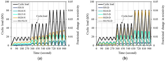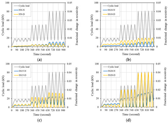 In general, when a compressive load is applied to a test specimen, the electrical resistance in the test specimen decreases, resulting in a negative FCR. However, in this study, to smoothly compare the behavior of compressive load and FCR, the FCR was multiplied by a negative number (−1) so that a positive value appeared. Figure 11 shows the relationship between cyclic compressive load and FCR over time, and incorporating of steelmaking slag in both normal and dry series increased FCR. Through this, it can be seen that steelmaking slag improves electrical properties as a conductive material, as reported by Baeza et al. [13] and Lee, Le, and Kim [14].
