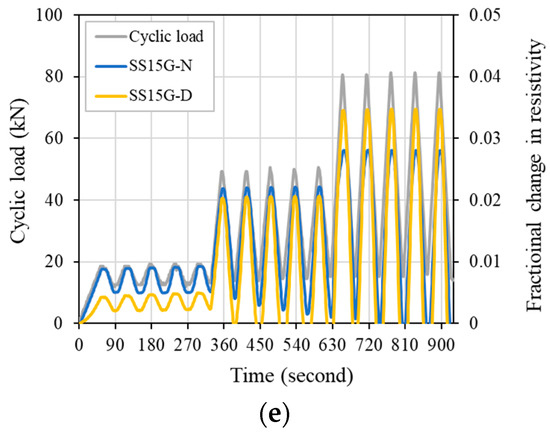 In the normal series, it can be seen that NN increases the FCR in a straight line according to the change in load in Stage 1 (load range: 10–20 kN). In contrast, for SS10, SS15, SS20, and SS15G, the FCR fluctuated flexibly with changes in load. This result reflects that the steelmaking slag used in this study contains a large amount (approximately 40%) of iron oxide that was distributed evenly within the concrete matrix to form conductive paths. It is noteworthy that gypsum had a positive effect on FCR as well as electrical resistivity when repeated loads were applied, so that the best FCR behavior and FCR values were shown even at low load ranges. In Stage 2 (load range: 10–50 kN), the FCR fluctuated similarly with the change of the load for all mixes. This is because the distance between the steelmaking slag that was distributed inside the concrete matrix decreased as the maximum load increased compared to Stage 1, thereby increasing the formation of conductive paths [12,36]. The increase in compressive load decreased the potential barrier, and, as a result, the movement of electrons may have become smooth, and the variation in electrical resistance increased [30,36]. As the replacement ratio of the steelmaking slag increased, the FCR also tended to increase. As a result, the conductive path in the concrete was improved with the increase in the proportion of steelmaking slag. In Stage 3 (load range: 10–80 kN), similar behavior to Stage 2 was observed, and the FCR fluctuated similarly with the change in load. As the replacement ratio of the steelmaking slag increased, a larger difference and higher FCR were observed, and the maximum FCR for SS15 in Stage 3 was approximately 0.012. The FCR increased by 43.45% and 131.24% for SS20 and SS15G compared to SS15, respectively, and SS15G had the best self-sensing characteristics in all stages. In the case of SS20, the FCR value gradually increased as the loads were repeated in Stages 2 and 3. This is because the distribution location of the steelmaking slag that previously formed the conductive path was affected by the increase of the maximum load [4,30].