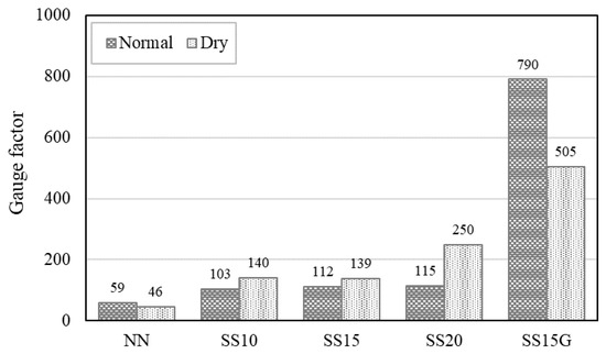 Figure 13 represents the GF of the all mixes. Both the normal and dry series showed a trend that the GF increased as the replacement ratio of the steelmaking slag increased. Similar to the results for electrical resistivity and electrical piezoresistivity, this result also indicates that the conductive path in the concrete matrix improved with an increase in the ratio of the steelmaking slag. In the normal series, the GF for SS10, SS15, SS20, and SS15G increased by 74.75%, 90.61%, 95.79%, and 1241.82% compared to NN. For dry series, SS10, SS15, SS20, and SS15G increased the GF by 206.18%, 203.93%, 446.62%, and 1005.60% compared to NN, respectively. Here, SS15G has 585.35% and 102.26% larger GF values in the normal and dry series, respectively, compared to SS20. SS15G showed similar electrical characteristics compared to SS20, but SS15G had superior resistance to external force compared to SS20. Due to these characteristics, SS15G showed the largest gauge factor value among all mixes.