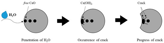In general, the conductivity of concrete is affected by the moisture in the concrete. Demircilioglu et al. [38] and Song and Choi [39] showed that, when the moisture in the concrete decreases, it affects the piezoresistivity of the concrete, reducing the GF of the concrete. In this study, dried specimens of NN and SS15G, as previously reported, showed lower GF, whereas SS10, SS15, and SS20 increased GF when specimen was dried. This is considered to be the effect of free CaO, an expansive compound in steelmaking slag. As the compressive load is repeated, the moisture in the concrete comes into contact with free CaO, and continuous volume expansion results in the occurrence of micro cracks. These cracks in the matrix gradually grow under repeated loads, and this phenomenon ultimately affects the electrical properties of concrete, breaking or rebuilding the conductive path in the matrix [3,22]. Normal series specimens contained more moisture in concrete than dry series, so that SS10, SS15, and SS20 of normal series were affected by FCR, and the GF was finally derived to be low. When the specimens were dried, the GF of SS10, SS15, and SS20 increased by 37, 27, and 135, respectively. Figure 14 depicts the progress of crack due to expansion of free CaO.