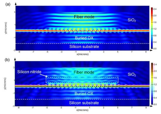 - Roelkens, G.; Thourhout, D.V.; Baets, R. High efficiency Silicon-on-Insulator grating coupler based on a poly-Silicon overlay. Opt. Express 2006, 14, 11622–11630. [Google Scholar] [CrossRef]