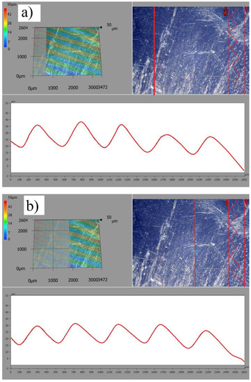In the initial period of use, the mechanics of contact surfaces during human motor activity is quite simple. The peaks of rough surfaces are elastically deformed and, after exceeding a certain value of pressure and friction resistance, plastic deformation of the peaks occurs, combined with their microabrasion. As a result of the cyclic fatigue load, the peaks will be remodeled to such an extent that the actual contact area will be large enough to transfer the external loads acting on the artificial joint. The process of rolling of the femoral component on the tibial part does not cause major changes during this period of use. However, the first surface scratches occur in the sliding area. The wear products are transported with the motion of the friction elements and accumulate in the final contact area. The surface image at 100× magnification with the surface profile is illustrated in Figure 8.