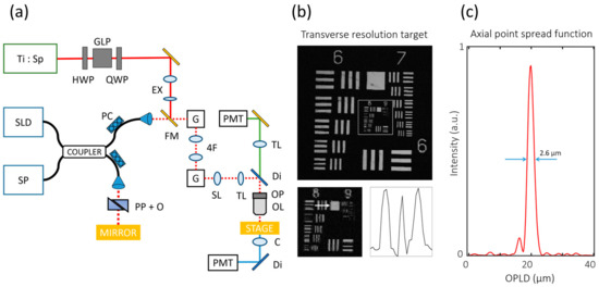 Graphical description of spectral domain Gabor-domain optical coherence microscopy (GD-OCM) system performance. (a) Schematics of GD-OCM with the second-harmonic generation microscopy (SHGM) system. (b) Transverse resolution measurement from the United states air force (USAF) 1951 resolution target. Element 1 in group 8 is the finest feature that can be resolved in both the X- and Y-axes. (c) The axial point spread function is 2.6 µm in water (zero-padded 8 times). (Ti:SP: titanium sapphire laser; SLD: superluminescent diode; SP: spectrometer; GLP: Glan laser polarizer; PC: polarization controller; EX: beam expander; FM: flip mirror; G: galvanometer mirror; SL: scanning lens; TL: tube lens; PP + O: prism pair with other dispersive optics; Di: dichroic mirror; OP: objective lens positioner; OL: objective lens; C: condenser lens; PMT: photomultiplier tube; OPLD: optical pathlength difference.).
