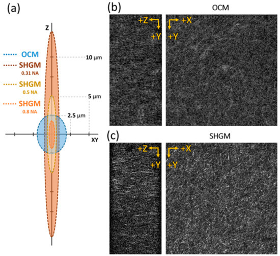 Cross-sectional and en face image of collagen fiber scaffolds (2.5 mg/mL). (a) Schematics of imaging point spread function (PSF) size in the axial (Z) and transverse (XY) axes for GD-OCM, and SHGM with different numerical aperture (NA) (0.31, 0.5, and 0.8 NA). (b) OCM images of collagen sample; (b) SHGM images of collagen sample. The cross-sectional ZY plane image in (c) shows a more anisotropic, elongated image than (b). The field of view is 320 × 320 × 160 µm3. Full-width at half maximum (FWHM) is used as the size of PSF.