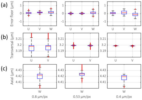 Boxplot of DVC analysis with various transversal sampling rates. U, V, and W indicate deformation in X-, Y-, and Z-directions, respectively. (a) Error floor and (b) virtual translation in the transverse axis, 3.20 µm in U and V. (c) Virtual translation in the axial axis, 4.42 µm in W. The red horizontal line is the median value. The top and bottom of blue box indicates the 25th and 75th percentiles. Red crossmark outside of the box denotes outlier.