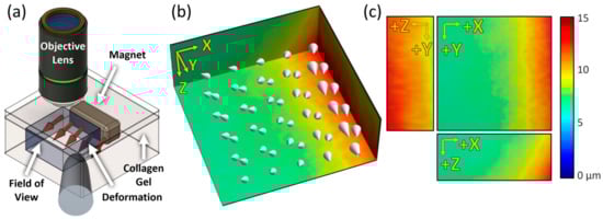 In order to deform the collagen gel structure without causing damage, a neodymium magnet was embedded in the matrix to generate external forces on the structure (Figure 4a). The position of the magnet was parallel to the YZ plane at the positive end of the X-axis in the field of view. The magnet was dragged by setting the tip of a steel rod at an arbitrary location, and the GD-OCM images were taken before and after the stimulus. Through DVC analysis, the magnitude and direction of displacement of the collagen structure were visualized with a 3-D color-coded map and cone arrows, respectively (Figure 4b). According to the direction and relative size of the cone arrows, the external force dragged the collagen gel structure in the negative Z-direction while pushing it in the negative X- and the positive Y-direction. As shown with the maximum intensity projection of each axis (Figure 4c), the largest displacement was around 15 µm on the side that contacted the magnet, and the farther away from the magnet, the smaller the displacement (below 6 µm). This means that our GD-OCM system and DVC analysis can quantitatively analyze the local deformation of the collagen matrix due to physical force and identify the direction and magnitude of an arbitrary external stimulus.
