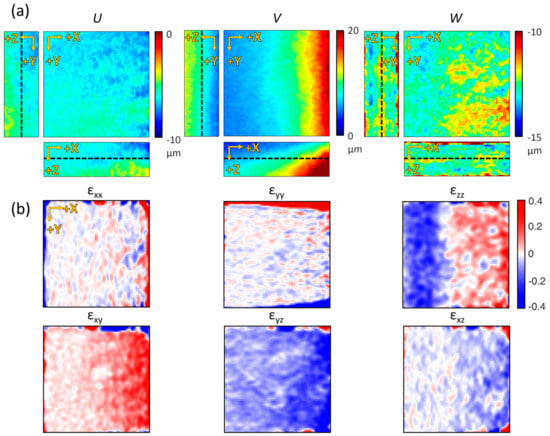 Displacement maps in each axis and their corresponding strain maps. (a) U, V, and W displacement map sliced along its center of volume. (b) Corresponding local strain maps. The selected Z-depth is the median of the axial field of view (indicated as black dashed lines in (a)) (all fields of view are 224 × 224 × 130 μm3).