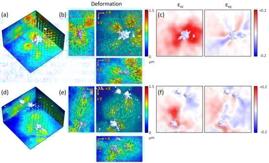 where denotes the deformation vector of the -th axis component. This means that the gradient of the displacement map can produce strain maps. However, this direct differentiation is susceptible to random noise. The effect of random noises was reduced by mean filtering of the displacement matrix. Additionally, instead of direct differentiation, central differential methods with 3 × 3 × 3 voxel kernels were used in our study [].