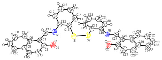NMR (proton and carbon, see Supplementary Files S1–S6, Figures S1 and S2), ATR–FTIR, and single-crystal measurements were made to confirm the chemical structure of ATNA. The ATR–FTIR spectrum of ATNA reveals the characteristic bands of aromatic Schiff base imine group (CH=N) at 1622 cm−1. It is noteworthy to observe, as shown in Figure 1, the absence of the vibration peak of the OH group, but instead the appearance of weak bands at 2972, 3001, 3061 cm−1 due to the stretching vibrations of C–H of imine and phenyl groups. The absence of OH vibration is attributed to the existence of the intramolecular hydrogen bond between OH and CH=N and S–S (Scheme 3), as it will be emphasized further below in 1H NMR and single-crystal data. This IR attribution is in accordance with a similar Schiff base reported earlier [14,15,55]. The stretching vibration frequency of aromatic disulfide (S–S) appears at 449 cm−1 as similarly reported [56]. The sharp band appearing at 744 cm−1 may correspond to disulfides (C–S stretch) and 1,2-disubstituted aromatic. The band at 819 cm−1 corresponds to the aromatic C–H bending vibration [56]. Moreover, the stretching vibrations due to C=N- appear at 1602 and 1586 cm−1. On the other hand, bands due to C=C aromatic and C-0 of phenolic groups appear at 1551, 1461, and 1217 cm−1, respectively.