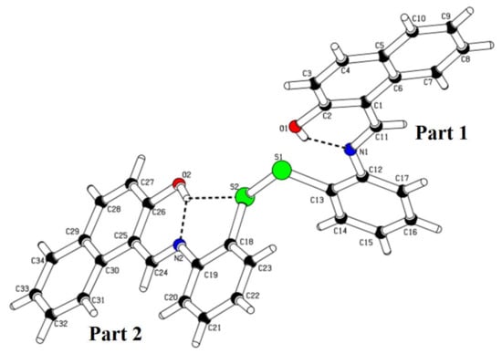 The molecule 1,1′-(-((disulfanediylbis(2,1-phenylene))bis(azaneylylidene))bis (methaneylylidene))bis(naphthalen-2-ol) is basically a dimer of 1-[(2-Mercapto-phenylimino)-methyl]-naphthalen-2-ol which are connected through a sulphur atom. The single crystal diffractions were carried out to support our spectroscopic data, the confirmation of the synthesized product and to attract the readers for further any applications. The S–S bond distance is 2.0234 (10) Å, which is in accordance with already published related structures [57]. The Schiff base parts (A and B) of the molecule around the S–S bonds have a different geometry, due to which there is no center of symmetry or point symmetry in it, Figure 2. The crystallographic parameters are given in Table 1, while selected bond lengths and bond angles are provided in Tables S1 and S2. In part A (C1–C17), the benzene ring and naphthalene rings were twisted at a dihedral angle of 2.396(1)° while the in part B (C18–C34), these rings were twisted at a dihedral angle of 28.396 (1)°. The conformation around the imine bond (C=N) in both parts is trans, favoring the molecule to stay in the most stable form. The molecule was stabilized by the O–H…N type intramolecular hydrogen bonding interactions (Table 2). These interactions produced six-membered ring motifs [S(6)] with the root mean square deviation values of 0.0250 (2)Å and 0.0190 Å for the rings (C1/C2/C11/N1/H1O/O1) and (C24/C25/C26/N2/H2O/O2). The former ring motif is turned at dihedral angles of 79.72(7) with respect to the benzene ring (C12–C17) while the later ring is twisted by 4.071(15) with the aromatic ring (C18–C23) Figure 3. The O2–H2O…N2 and O2–H2O…S2 interactions produced two ring motifs (Figure 3 and Figure S3), (i) a nine-membered ring motif (C18/C19/N2/C24/C25/C26/O2/H2O/S2) which can be represented mathematically as S(9) [58], (ii) a five-membered ring motif where O2 acts as donor atom via H2O to N2 and S2 so this can be represented as S12(5). From Figure S4, we can observe that planes of aromatic benzene and naphthalene are parallel to each other give rise to the π–π interactions among them to afford the extra stability to the crystal structure of the subjected compound.