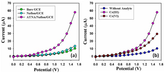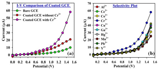 At first, a change in the current response of the modified GCE (ATNA/Nafion/GCE) against the potential applied was recorded and evaluated with bare GCE. It was observed, that the ATNA/Nafion/GCE shows the high current response in contrast to a non-modified GCE due to the sensitive and excellent communication of the electron transduction in a PBS medium at the liquid/surface electrode interface, Figure 4a. After that, a selectivity study was conducted, and it was found to be very selective against the Cr3+ ions in the presence of other heavy metal cations such as Al3+, Ce3+, Co2+, Cu2+, Ga3+, Hg2+, Mn2+, Pb2+, and Y3+, Figure 4b. After the confirmation of selectivity of a newly modified GCE (ATNA/Nafion/GCE) against the Cr3+ ions, then a change in the current response of ATNA/Nafion/GCE against the potential applied was also checked in the presence and absence of a Cr3+ ion in order to check its affinity for Cr3+ ions. It was noticed that newly modified GCE gives a high response in the presence of Cr3+ ions as compared to its response in the absence of Cr3+ ions in PBS of pH = 7, Figure 4a.