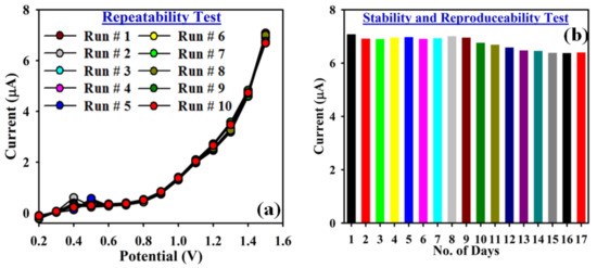 Repeatability and stability study: (a) the repeatability rest; and (b) the stability test of newly modified GCE (ATNA/Nafion/GCE as an efficient and sensitive Cr3+ cationic electrochemical sensor).