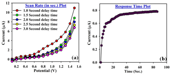 Response time: (a) the evaluation of the scan rates against the potential applied (0–1.5 V); and (b) the response time from 10 to 20 s to reach the saturated steady state.