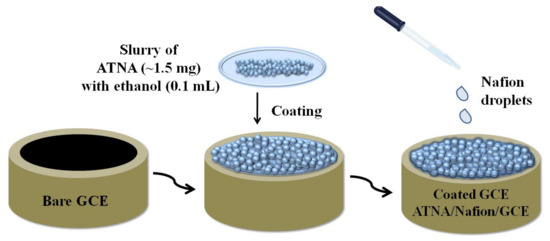For the fabrication of ATNA/Nafion/GCE as a selective Cr3+ electrochemical sensor, a simple and reliable approach was practiced. The geometrical dimension of the GCEs that were used for the fabrication of GCE as a selective Cr3+ electrochemical sensor, was 12 cm in length with a copper rod and 0.0316 cm2 in surface area. Before the fabrication of the GCE, it was washed by using a very simple protocol. First, the GCE was dipped in acetone for 10 min. After that, it was washed thoroughly with deionized water followed by ethanol-soaked cotton buds and dried in an oven for 15 min at 80 ºC. After proper washing, a slurry of approximately 1.5 mg of synthesized ATNA was made with ethanol, and then applied onto the flat surface of GCE with one to two drops of 5% ethanolic Nafion as an adhesive conducting binder. Then, the freshly fabricated electrode was dried at 35 ºC for 45 min in an oven in order to get the ATNA/Nafion/GCE as a selective and sensitive Cr3+ electrochemical sensor, Scheme 1. This newly designed ATNA/Nafion/GCE as a selective Cr3+ sensor was therefore used as a working electrode to measure the I-V (current-potential) response in a phosphate buffer saline (PBS) medium of pH = 7, in the presence or absence of Cr3+ ions, in a lab-made electrochemical cell (beaker) in which Pt-wire was used as a counter electrode. The (PBS) medium of pH = 7 was made by mixing the equimolar solution of disodium phosphate (0.2 M, 39.0 mL) with monosodium phosphate (0.2 M, 61.0 mL) in a 100 mL measuring flask. In the whole study, Cr3+ was used as a target analyte in the presence of other interference cations. The stock solution of Cr3+ was used to get the different concentration range of Cr3+ (full concentration range: 0.01 nM ~ 0.1 M) in deionized water by dilution method. Similarly, the amount (10.0 mL) of (0.2 M) PBS of pH = 7 was kept constant in every trial or throughout the whole study in a lab-made electrochemical cell in order to measure the I-V response, in the presence as well as in the absence of the target analyte. Correspondingly, different analytical parameters such as sensitivity, full concentration range as well as linear dynamic range (LDR), regression coefficient r2, the limit of detection at S/N 3 (LOD) and limit of quantification (LOQ), for Cr3+ were also measured from the slope of the calibration plot (current versus concentration) by using the newly designed ATNA/Nafion/GCE as a selective Cr3+ sensor.