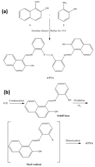 It was envisioned that having disulfide-containing homobifunctional Schiff base as a tridentate ligand would make a stable film on a glassy carbon electrode for the electrochemical detection of toxic metal ions from aqueous solution. Little information on ATNA with a different single-crystal structure from the present one has been reported [16]. The synthesis of ATNA was easily obtained in one step in excellent yield by refluxing the 1:1 molar ratio of 2-aminothiphenol and 2-hydroxynaphthaldehyde in absolute ethanol for 19 h (Scheme 2a). The single crystal of the product was obtained by recrystallization from toluene. It is suggested that the formation of the ATNA ligand proceeds via condensation to get the corresponding Schiff base, which further undergoes the in situ oxidation of thiol to the corresponding disulfide by virtue of the dissolved oxygen. The oxidation proceeds via a thyil radical in a one-electron transfer process that dimerizes to give the disulfide (Scheme 2b) [54].