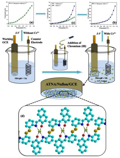 Therefore, it is of great interest to develop a new, trustworthy, efficient, selective and cost-effective (cheap) techniques for the detection of chromium ion (Cr3+), qualitatively, and quantitatively. In this study, an electrochemical approach, current-potential (I-V) technique, based on newly modified glassy carbon electrode, 1,1′-(-((disulfanediylbis(2,1-phenylene))bis(azaneylylidene))bis(methaneylylidene))bis(naphthalene-2-ol) (ATNA)/Nafion/GCE, as an agile and selective electrochemical sensor, was applied for the first time for the practical determination of Cr3+ ions in an aqueous media (phosphate buffer saline (PBS)). The modified GCE (ATNA/Nafion/GCE) was fabricated by coating the newly synthesized, homobifunctional tridentate ATNA Schiff base, which acts as a chelating agent onto its flat surface followed by 5% ethanolic Nafion as conducting the polymer binder. It furnishes the very sensitive transduction at the interface of liquid/surface electrode in phosphate buffer saline (PBS) (0.1 M at 7.0 pH). To the best of our knowledge, this is the first cationic electrochemical sensing application based on the current-potential technique by using a newly modified GCE as a working electrode for sensing the Cr3+ ions within a very short response time of 10 to 20 s, qualitatively and quantitatively, in an aqueous neutral solution.