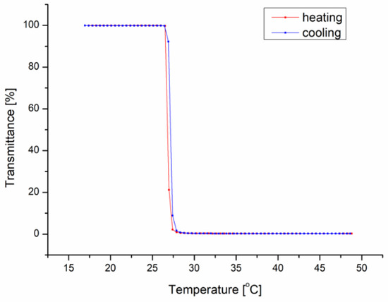 Sample temperature-transmittance curves for the solution obtained after the dissolution of the P(iPrOx-nPrOx) mold.