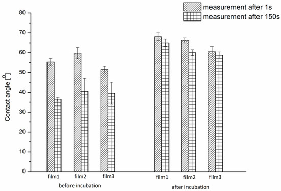 The wettability of the P(iPrOx-nPrOx) films supported on silica slides was measured using a CAM101 goniometer equipped with a temperature control unit (Intelligent digital controller OMRON 5EGN) connected to a thermostatically controlled chamber. The contact angle measurements were performed following the sessile drop method. A water droplet was placed on the surface and was registered for 150 s. The measurements were performed at room temperature for films in a dry state and at 40 °C for films after incubation. The contact angle values were calculated as average from three measurements.