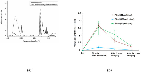 For the water uptake studies, composition analysis of P(iPrOx-nPrOx) films was performed by FT-IR, and the weight gain of the layers after incubation in water at 40 °C was analyzed. Composition analysis was monitored by FT-IR for the films in the dry state, directly after incubation in water at 40 °C and after 1 h and after 24 h of subsequent sample drying at 40 °C. The sample FT-IR spectra of Film 2 in the dry state and directly after incubation are shown in Figure 5a.