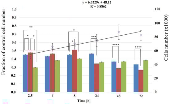 Percentage of fibroblasts cultured on P(iPrOx-nPrOx) films and TCPS. The fraction of control cells and cell numbers were assayed from 2.5 to 8 h for adhesion and spreading and for proliferation; the assays were conducted after 24, 48, and 72 h. The results for Films 1–3 are shown in blue, red, and green, respectively. The line presents the changes in the number of cells cultured on TCPS from 2.5 to 72 h of the incubation. Statistical analysis was performed using two-tailed Student’s test. Stars indicate p-values: * p < 0.05, ** p < 0.01, *** p < 0.001, **** p < 0.0001. Values are mean ± SD (n = 3).