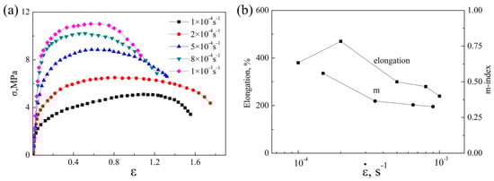 Figure 1a displays the true stress–true strain curves at 490 °C and an initial strain rate range between 1 × 10−4 s−1 and 1 × 10−3 s−1. Based on the resulting change in the true stress–true strain curves, the strain rate sensitivity index m can be calculated as follows: