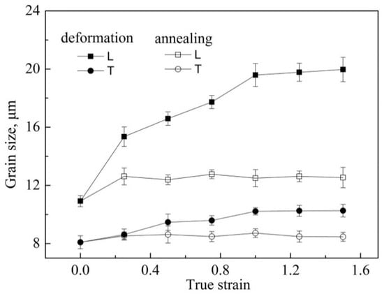 The elongation and m-index as a function of the strain rate is shown in Figure 1b. The stress value at the steady state increased from 4.0 to 11.0 MPa, with increasing initial strain rate. The maximum elongation (470%) was obtained when the initial strain rate was 2 × 10−4 s−1, and the corresponding m-value was about 0.5. Figure 2 shows the grain dynamic and static grain growth behaviors in both the longitudinal (L) and the transverse (T) directions during superplastic deformation and simultaneous static annealing at the same temperature. The grain size increased during superplastic deformation, especially in the longitudinal direction, which nearly doubled from 10.9 μm to 19.9 μm, with a true deformation strain of e = 1.5 compared with the non-deformation samples, and the grain size in the transverse direction increased from 8.1 μm to 10.3 μm. Therefore, the grain was elongated along the tensile direction and the aspect ratio of the grain increased from 1.4 to 2.0. However, the grain size of the static annealing sample only increased slightly in the initial stage, and then stabilized in both directions. This indicates that the grain had good thermal stability under static annealing.