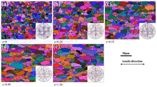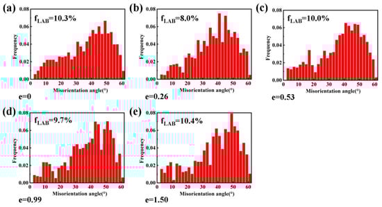 Figure 3 shows the EBSD orientation images and {110} pole figures after superplastic deformation at 490 °C and 2 × 10−4 s−1. In the orientation images, low-angle boundaries (LABs, misorientation < 15°) and high-angle boundaries (HABs) are marked by white and black lines, respectively. The samples before deformation had completely recrystallized nearly equiaxed grains. There was no obvious optimal distribution direction of the LABs before deformation. However, most of the LABs were distributed along the transverse direction and the elongated grains were divided during superplastic deformation. A very weak texture was found in undeformed samples and was completely destroyed at a strain of 0.26, which is related to the random rotation of grains during superplastic deformation [26]. There was no obvious change in the misorientation distribution of the grain boundaries, and the proportion of LABs was maintained at about 10%, as shown in Figure 4.