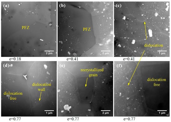 The diffusion creep in superplastic deformation often leads to the occurrence of particle-free zones (PFZs) within the transverse grain boundaries. The obvious PFZs (Figure 5b–f) were observed by SEM when the strain was greater than 0.53, and when the strain was less than 0.99; PFZs were mainly distributed along the transverse grain boundaries. Moreover, PFZs also appeared along the longitudinal grain boundaries when the strain was greater than 0.99, which may have been the result of grain rotation during superplastic deformation. When the strain continued to increase to 1.50 (Figure 5e), some grains composed entirely of PFZs appeared.
