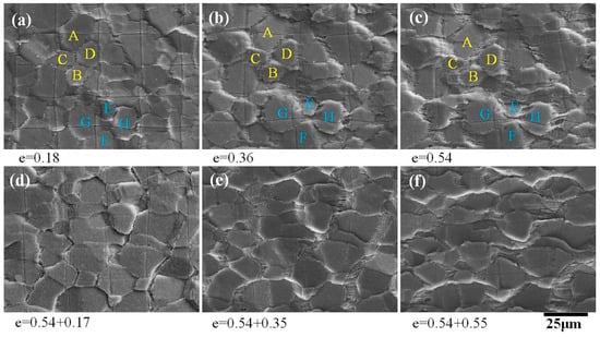 At the primary stage of superplastic deformation, the fine grids within the grains were not deformed and still maintained their original shape and size (Figure 8a,b). However, obvious intragranular deformations occurred in several grains (Figure 8c–f), inside which the dimensions of the fine grids parallel to the tensile principal stress became longer, their dimensions parallel to the compressive principal stress became compressed, and the number of deformed grains increased with the increase in strain (Figure 8e).