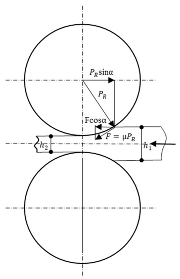where μ is the coefficient of static friction, α is the bite angle, PR is the rolling pressure, and F is friction shear stress.