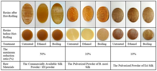 Figure 3 shows photographs of the three types of silk resins after various pretreatments (including original resin, ethanol treatment, and boiling treatment) and those resins after hot-rolling with the maximum rolling reduction ratios. The treatment of all silk resins is shown through the pictures in the second row. After that, the treated silk resins were hot-rolled in several reduction ratios (5%, 10%, 20%, 30%, 40%, and 50%). The pictures in the first row present the hot-rolled resins with the maximum reduction ratio. The maximum rolling reduction ratio, which was 50%, was used for the resin derived from RS powder. However, for the resins derived from the pulverized powders of B. mori silk and Eri silk threads, the hot-rolling process is ineffective, even at the lower reduction ratio, i.e., 10% (see Figure 3). This result may be explained by the fact that Young’s modulus of resin derived from B. mori silk and Eri silk (8.7 and 8 GPa, respectively [20]) significantly exceeds that of resin derived from RS powder (4.5 GPa [18]). Therefore, silk resin made from RS powder is more easily processed by hot-rolling than resin made from B. mori or Eri silk powders, which have massive chains of silk fibroin. This phenomenon is due to the strong silk-fibroin peptide-strand structure of these two resins that prevented the B. mori silk resin and Eri silk resin from the hot-rolling process. Moreover, a similar observation reported in [10] indicates that regenerated silk derived from degumming and dissolution, the process of which was similar to that used herein to obtain RS powders, severely degrades the peptide-strand structure of silk fibroin. Because of the degraded peptide-strand structure, the RS resin was softened, which is the most important condition supported for the hot-rolling process.
