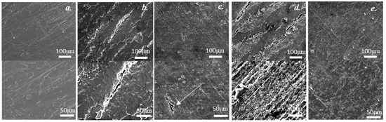 Scanning electron microscope (SEM) images of the RS original resin and the RS hot-rolled resins with the different treatments and 50% reduction ratio: (a) the original RS resin; (b) the RS hot-rolled resin without treatment; (c) the RS hot-rolled resin with 40 vol% ethanol treatment; (d) The RS hot-rolled resin with 100 vol% ethanol treatment; (e) the RS hot-rolled resin with boiling treatment.