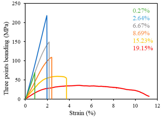 Figure 5 shows the three-point bending strength as a function of strain for RS hot-rolled resins with a rolling reduction ratio of 50% and for different water contents. The results show that a long drying time increases the bending strength and the Young’s modulus but decreases the strain by decreasing the water content. The initial water content of the RS hot-rolled resin is in the range 10–20 wt%, which is considered to be freezing water; this result explains somewhat the breaking of the hydrogen bond between the molecules of amorphous silk, which is why the resin with high water content is easier to hot-roll than the resin with low water content.