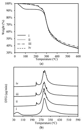Thermogravimetric analysis (TGA) (a) and difference thermo gravimetry (DTG) (b) of the RS powder, the original RS resins, and the RS hot-rolled resin with 50% reduction ratio, (i. RS powder; ii. RS original resin; iii. RS hot-rolled resin without treatment; iv. RS hot-rolled resin with boiling treatment).