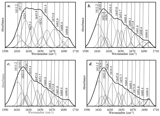 The ATR-FTIR spectra and the curve fitting of the ATR-FTIR spectra to determine the secondary of amide I: (a) the RS powder, (b) the original RS resin, (c) the RS hot-rolled resin without the boiling treatment, (d) the RS hot-rolled resin with the boiling treatment.