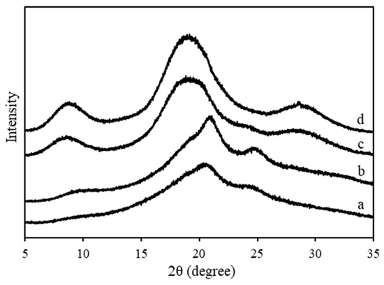 Figure 9 shows the XRD spectra, and Table 6 lists the separation of all peaks. The peak intensities of silk II increase in the following order: RS powder < original RS resin < RS hot-rolled resin without boiling-water pretreatment < RS hot-rolled resin with boiling-water pretreatment. In addition, the peak position after resinification shifts to higher angles whereas that for hot-rolling shifts to lower angles. The percent crystallinity of the silk samples increases in the following order: RS powder 29.3% < original RS resin 38.8% < RS hot-rolled resin without boiling-water pretreatment 54.4% < RS hot-rolled resin with boiling-water pretreatment 57.7%. Additionally, peak 2 of the RS powder indicates that the lattice spacing of 4.6 Å decreases to 4.4 Å, which corresponds to silk I after resinification [58]. After hot-rolling, lattice spacing increases to 4.7 Å, which corresponds to silk II [58]. A similar explanation holds for peak 3, with a lattice spacing of 4.3 Å (silk II) for the RS powder, decreasing after hot-rolling to 3.1 Å (silk I) for RS resin [58].