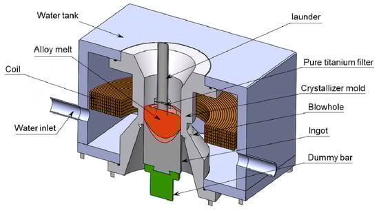 Al-Mg-Li alloys have been widely applied in aeronautics and spaceflight due to their outstanding comprehensive performance in terms of their low density, medium strength and high elastic modulus [1,2,3]. However, they are liable to cause some casting defects including coarse grain, severe dendrite structure (micro-segregation) and center line macro-segregation. In particular, the macro-segregation of large sized ingots produced by conventional direct chill casting (DCC) processes is serious [4], owing to the broad crystallization temperature interval of the alloy and the unsuitable heat transfer condition at the solidification front during casting [5], which not only reduces the yield rate of the alloy but also causes some adverse effects on its micro-structures and mechanical properties. Macro-segregation refers to the non-homogeneous distribution of alloying elements over a larger length scale, while micro-segregation is the in-homogeneity of the chemical composition on the scale of a single grain or dendrite. What makes macro-segregation acutely troublesome is that it cannot be eliminated by downstream processing, unlike micro-segregation, which could be relieved relatively easily by homogenization treatment. Therefore, it becomes rather important to minimize the effects of macro-segregation.