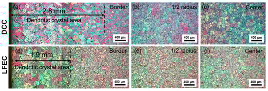 Micro-structure from border to center of as-cast 5A90 ingots: (a–c) direct chill casting (DCC) ingot; (d–f) low-frequency electromagnetic casting (LFEC) ingot.