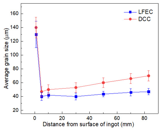 Figure 2 demonstrates the micro-structure of the ingots cast by DCC and LFEC with 10 Hz/100 A. In general, the micro-structure of the DCC ingot mainly consisted of coarse rose-like dendrite grains with a larger size and showed high in-homogeneity with an increase in grain size from the border to the center of the ingot. The border of the ingot had a wide dendritic crystal area with a width of approximately 2.8 mm. With the application of the LFEC process, the micro-structure became smaller and more uniform, while the refinement effect of LFEC at the center was slightly weaker than that at the border. The grain morphology was translated from rose-like dendrite grains to fine equiaxed grains under the influence of the LFEC. It is also notable that the width of the dendritic crystal area was reduced to less than 2.0 mm. To understand the refinement effect, the average grain size was measured. Figure 3 shows the grain size distribution from the surface to the center. It could be obviously found that the grain size of the LFEC ingot was smaller than that of the DCC ingot and the difference of the grain size in the LFEC ingot along the radius was smaller as well. For the DCC ingot, the grain size at the border was about 50 μm and at the center was close to 70 μm. In comparison, the grain size at the border of the LFEC ingot was about 40 μm and at the center was less than 50 μm. Therefore, the LFEC process could significantly refine the grain and shorten the width of the columnar grain area of ingots.