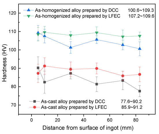 In order to further study the effect of macro-segregation on the hardness of ingots under DCC and LFEC, the hardness of the as-cast and as-solution alloys was measured by a Vickers hardness tester. Figure 5 shows the Vickers hardness distribution of 5A90 alloy along the radial direction. It is evident from the figure that the hardness of the LFEC alloy was higher than that of the DCC alloy in both as-cast and as-solution forms. The hardness of the DCC ingots decreased along the radial direction from the border to the center. However, with the application of LFEC, the hardness difference along the radial direction clearly decreased, and the hardness tended to be more uniform. The increment of hardness in the as-cast alloy can be attributed to grain refining and solution strengthening, which is consistent with the experimental results shown in Figure 3 and Figure 4. The results reveal that the hardness of ingots along the radial direction is strongly affected by LFEC, and this effect is carried from the casting stage to the solution treatment stage.