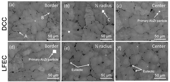 Figure 6 shows the morphology of the phases of the as-cast 5A90 alloy in the different positions. In both DCC and LFEC alloys, there were three kinds of structure distributed in the Al matrix. According to the EDS results, as shown in Figure 7, it could be speculated that the point A is an Mg-rich eutectic phase, point B is an Fe-rich inter-metallic compound and point C is a primary Al3Zr particle. The primary Al3Zr particles presented square and rhombus shapes, and the size generally did not exceed 30 μm. Some of the primary Al3Zr particles existed in the center of the grain as heterogeneous nuclei, and the other coarse primary particles got together and distributed at grain boundaries. It was reported the coarse primary Al3Zr particle would be very difficult to dissolve into the matrix during the homogenizing [11]. It can also be observed from Figure 6 that the laminar eutectic phase in the DCC alloy was coarse and very uneven. After the application of LFEC, the morphology of the fine eutectic phase replaced the coarse laminar eutectic phase.