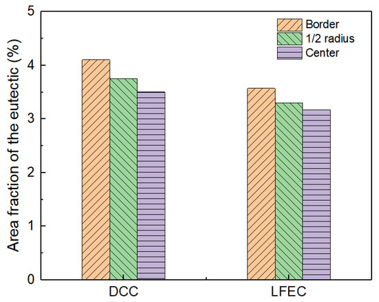 During the non-equilibrium solidification process, the solidified grain of the solidification front continuously discharges the alloying elements into the front of the solid/liquid interface. At the late stage of solidification, a large amount of alloying elements accumulate in the inter-dendritic residual liquid, and then a non-equilibrium eutectic is formed at the grain boundary. The fraction of eutectic in the grain boundary can be used as an indicator of micro-segregation. In our study, the area fraction of eutectic in the DCC and LFEC as-cast alloys in the SEM images were accounted for by Image-Pro soft, as shown in Figure 8. The area fraction of eutectic in the DCC alloy decreased from 4.11% in the border of the ingot to 3.75% in the 1/2 radius of the ingot and 3.5% in the center of the ingot. Meanwhile, in the LFEC alloy, the area fraction of eutectic from the ingot’s border to the center of the ingot was 3.57%, 3.30% and 3.17%, respectively. Under the same position of the ingot, the eutectic of the DCC alloy was much greater than that of the LFEC alloy. This indicates that the LFEC can inhibit the formation of coarse Mg-rich eutectic.
