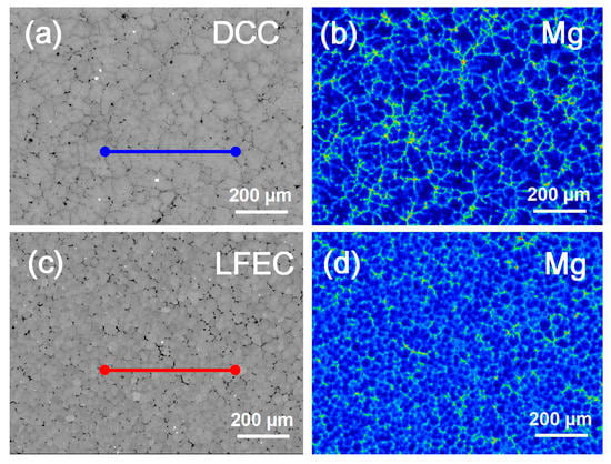 SEM images and Mg element mapping of 1/2 radius position of 5A90 as-cast alloy. (a) SEM image of DCC alloy, (b) Mg element mapping of DCC alloy, (c) SEM image of LFEC alloy, (d) Mg element mapping of LFEC alloy.