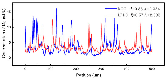 To further investigate the micro-segregation occurring in the micro-structure of DCC alloys and LFEC alloys, electron probe micro analyzer was carried out in order to quantitatively analyze the concentration of main alloying elements at the 1/2 radius of the as-cast alloy. Respectively, along the lines across the coarse dendritic grains and equiaxed grains in Figure 9a,c, the line scan results of the Mg element as detected by EPMA are illustrated in Figure 10. It can be seen from Figure 9 that the Mg element was segregated along the grain boundary, forming coarse eutectic phases and presenting a dendrite profile in the DCC alloy. By contrast, with the grains being refined and eutectic phases becoming finer, the distribution of the Mg element showed a higher uniformity in the LFEC alloy. Line scan measurements of the DCC alloy represent a considerable difference in the concentration of Mg between the interior of the grain and the grain boundary, while the fluctuation of the line scan measurements of the LFEC alloy is relatively small. In this work, the element distribution uniformity parameter is utilized to judge the degree of micro-segregation, average concentration of Mg in the scan line (A), standard deviation of concentration of Mg in the scan line (S) and distribution uniformity parameter of Mg element (ξ), which are calculated as shown in Equation (2).