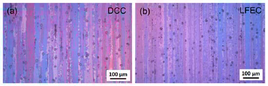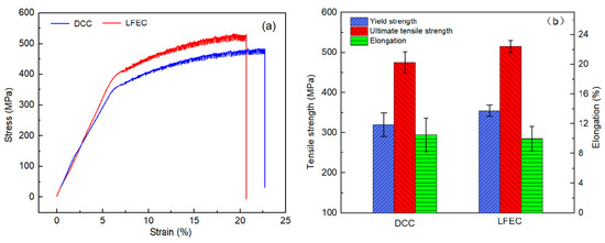 To illustrate the refinement effect of LFEC on the micro-structure, the micro-structures of the 5A90 DCC and LFEC as-aged alloys are shown in Figure 11. These are composed of strip-like grains arranged along the extrusion direction and some second-phase particles distributed along the grain boundaries. The average width of the strip-like grains decreases from 27.5 μm in DCC to 19.2 μm in LFEC. This fully demonstrates that the refinement effect of LFEC on grain size and morphology could be transmitted from the casting stage to the aging stage.