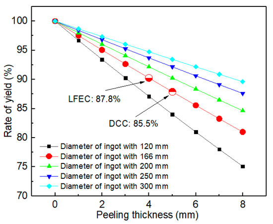 Figure 12 demonstrates the tensile properties of the 5A90 DCC and LFEC as-aged alloys. After applying the LFEC, the average ultimate tensile strength and yield strength of the as-aged alloys increased by 40 MPa and 33 MPa, respectively. The elongation could be considered to remain invariable. The improvement in tensile properties could mainly be attributed to the effect of solid solution strengthening and grain refinement strengthening. It is worth noting that the standard deviation of the strength and elongation of the alloy significantly decreased after applying the LFEC. This suggests that the stability of the tensile properties of the LFEC alloy could be improved by suppressing macro-segregation. In addition, the variation of yield as a function of peeling thickness in the different diameters of the ingot is shown in Figure 13. According to the calculations, the rate of yield increases with a decrease in peeling thickness. Based on the experimental results presented in Section 3.1 and Section 3.2, LFEC could significantly shorten the width of the columnar crystal area and the strong negative segregation area; thus, the peeling thickness could decrease from 5 mm to 4 mm. Due to this result, the rate of yield will increase by 2.3%. In short, applying LFEC can not only improve the stability of an alloy’s mechanical properties but also increase its rate of yield.