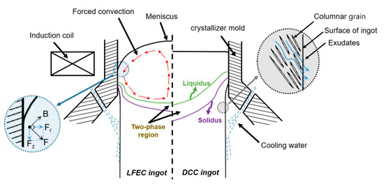 The mechanism of forced flow of melt under a low-frequency electromagnetic field during semi-continuous casting has been fully and extensively investigated. In the LFEC process, the melt is subjected to electromagnetic body forces. The Lorentz force consists of two parts, which are expressed as shown in Equation (3).